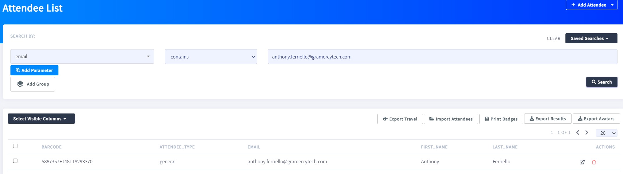 - Locate the attendee profile using the search criteria email contains followed by the email you recieved. Click on the edit icon to enter the attedee record.