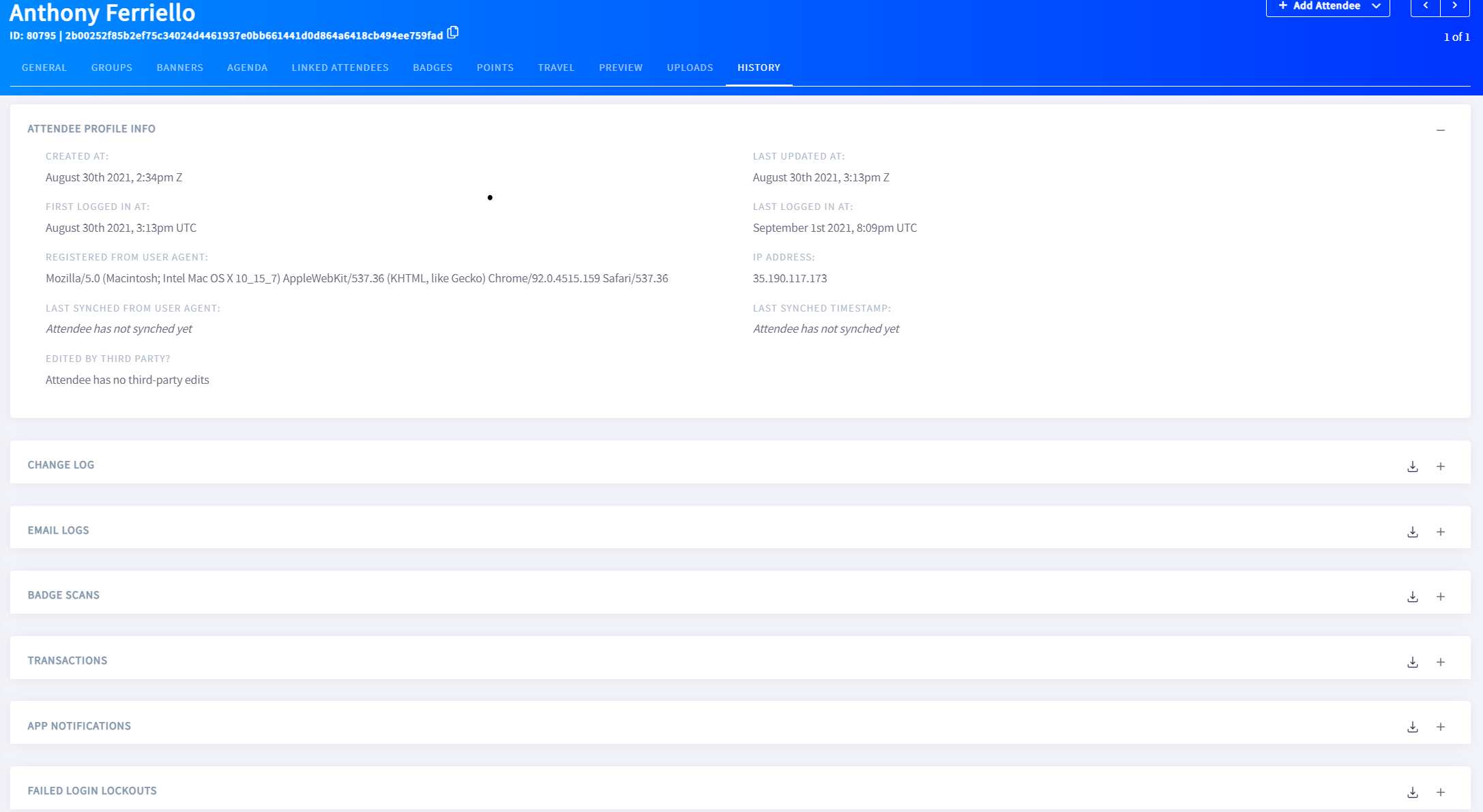 - Once in the correct attendee record locate the History tab within the navigation panel and scroll to the bottom section labelled Failed Login Lockouts.