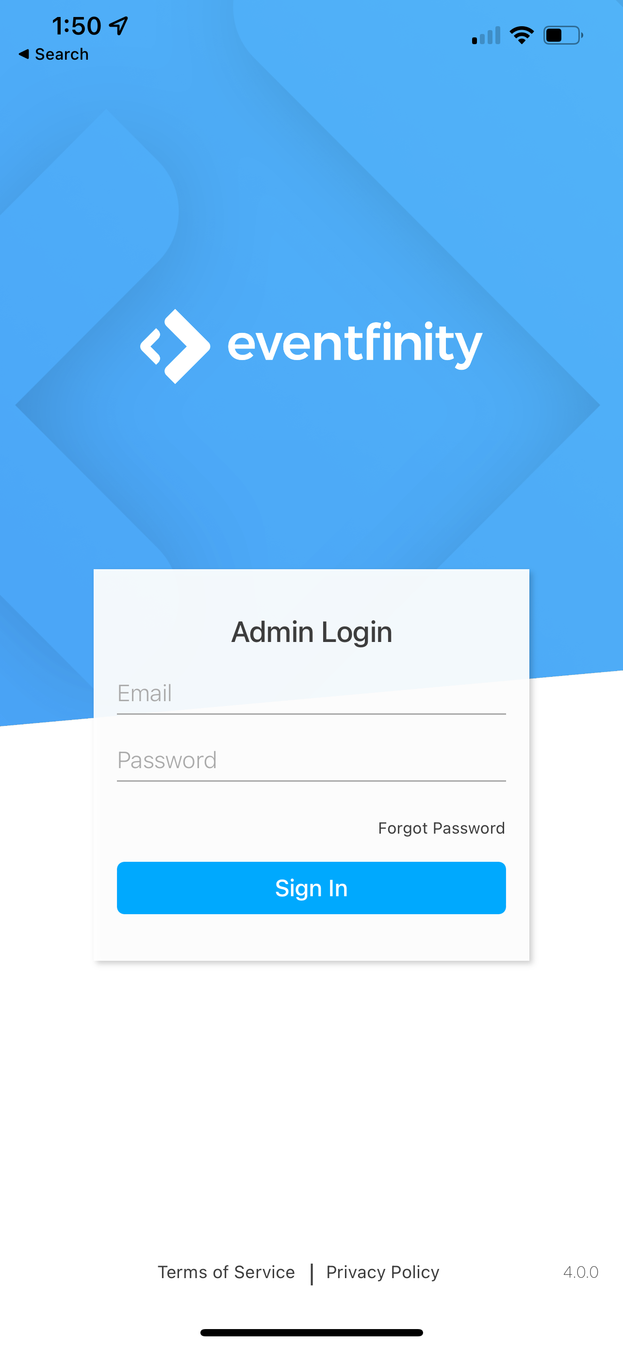 - Once downloading is complete, open the Check-in app and using an Admins dashboard credentials, log in.